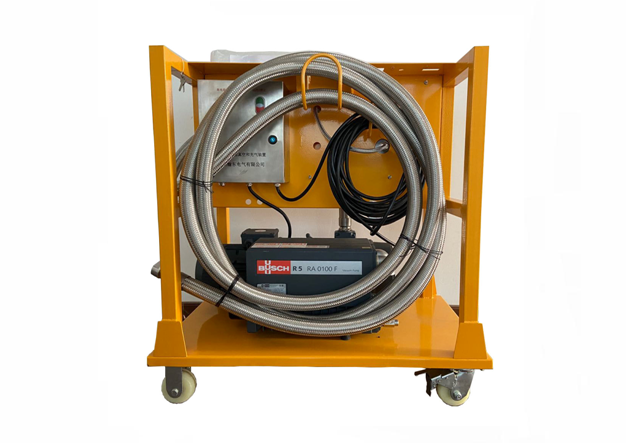 隨著電力行業的迅猛發展,電力行業大量設備的投入,尤其是SF6電器設備的不斷增加,對SF6電器設備的安裝調試以及檢修維護的要求越來越高,為了適應市場的需要,加上本公司多年從事SF6電氣設備的試驗、檢測以及相關的專業技術經驗的積累;并借鑒國外最先進的SF6電氣維護設備技術,開發出國內技術一流的JX6702 SF6抽真空和充氣裝置(如下圖)。本裝置專門用于對SF6斷路器氣室抽真空,有多種功率和多種最終真空度的真空泵可選。