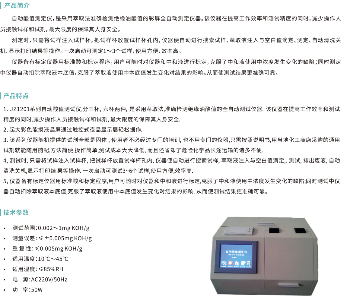 自動酸值測定儀,是采用萃取法準確檢測絕緣油酸值的彩屏全自動測定儀器。該儀器在提高工作效率和測試精度的同時,減少操作人 員接觸試樣和試劑,最大限度的保障其人身安全。 測定時,只需將試樣注入試樣杯,把試樣杯放置試樣杯孔內,儀器便自動進行搜索試樣、萃取液注入與空白值滴定、測定、自動清洗關 機、顯示打印結果等操作。一次啟動可測定1~3個試樣,使用方便,效率高。