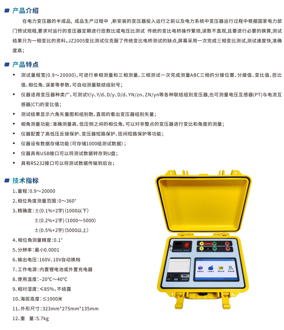 在電力變壓器的半成品,成品生產過程中,新安裝的變壓器投入運行之前以及電力系統中變壓器運行過程中根據國家電力部 門預試規程,要求對運行的變壓器定期進行匝數比或電壓比測試傳統的變比電橋操作繁瑣,讀數不直觀,且要進行必要的換算,測試 結果只為一相變比的資料。JZ2005變比測試儀克服了傳統變比電橋測試的缺點,屏幕采用一次完成三相變比測試,測試速度快,準確 度高;