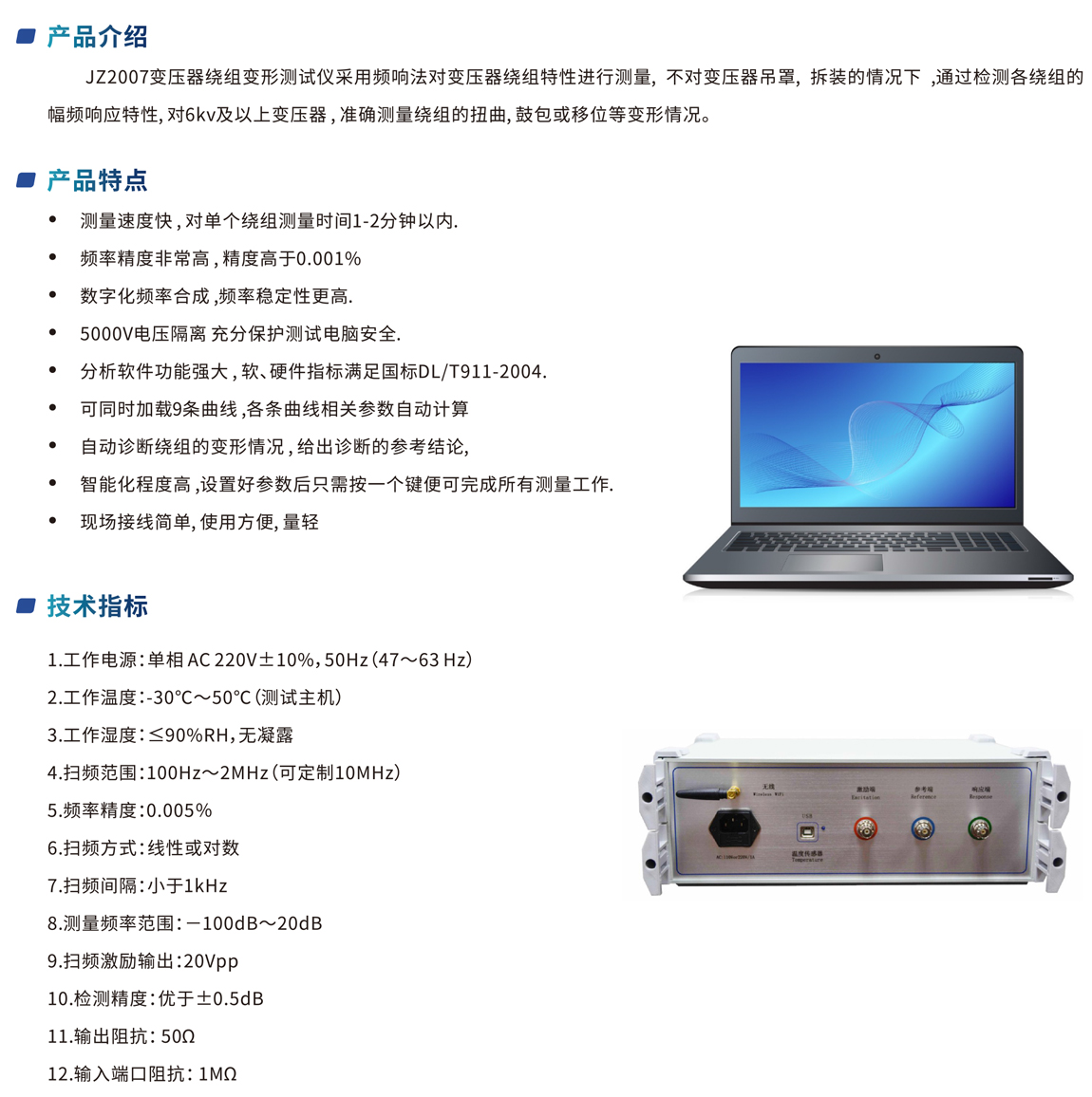 JZ2007變壓器繞組變形測試儀采用頻響法對變壓器繞組特性進行測量,不對變壓器吊罩,拆裝的情況下,通過檢測各繞組的 幅頻響應(yīng)特性,對6kV及以上變壓器,準(zhǔn)確測量繞組的扭曲,鼓包或移位等變形情況。