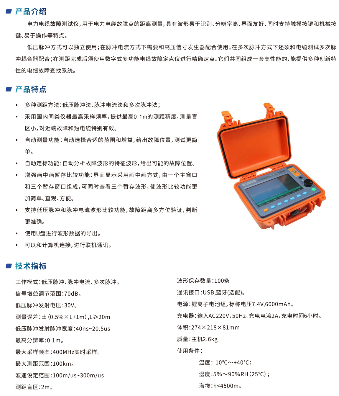 電力電纜故障測試儀,用于電力電纜故障點的距離測量,具有波形易于識別、分辨率高、界面友好、同時支持觸摸按鍵和機械按 鍵、易于操作等特點。
