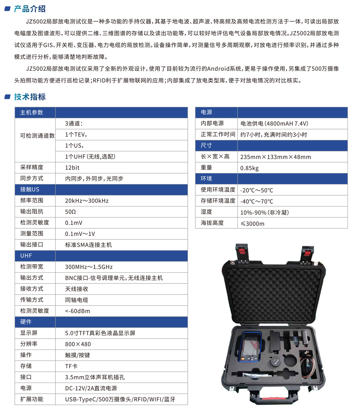 JZ5002局部放電測試儀是一種多功能的手持儀器,其基于地電波、超聲波、特高頻及高頻電流檢測方法于一體,可讀出局部放